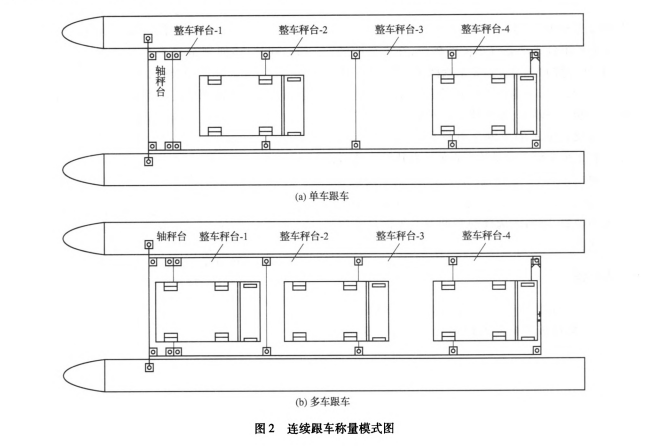 組合式動態地磅的連續跟車稱量模式是指在前一輛車全部或部分軸未下秤臺的情況下,其后的車輛已經開始上秤,通常具有以下兩種情況:單 車跟車和多車跟車,如圖2所示。