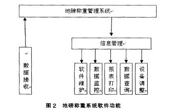 系統軟件是整個系統的核心。軟件采角基于 WINDOWS XP操作系統的地鎊稱重系統管理軟 件。該軟件主要分為兩個功能塊:一個功能塊是數 據發送端軟件接收管理,主要處理稱量數據的信息 采集和發送,將計量數據從儀表接收端發送到計算 機數據接收端自動將數據存儲在電腦上,并在稱量 軟件上實時顯示數據;另一個主要功能塊是完成數 據的接收形成數據的信息管理,包括軟件維護、數 據監控、報表統計、資料打印、數據查詢和現場計量 設備的跟蹤調整。軟件功能示意如圖2所示。