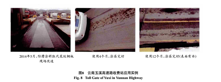 云南玉溪高速路收費站位于下坡中,車道通車大車為主,常年道面潮濕,日均通車大車600多車次,小車400多車次。在超過1  a的使用過程中,涂層狀態和防滑效果均表現良好(見圖8),仍在繼續使用中。