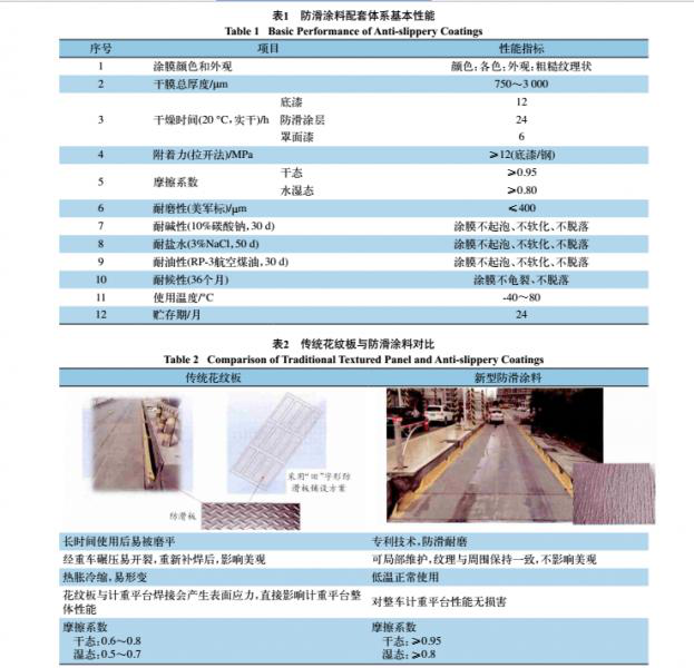 地磅防滑涂料較傳統花紋板相比,具有明顯性能優勢。對比情況如表2所示。